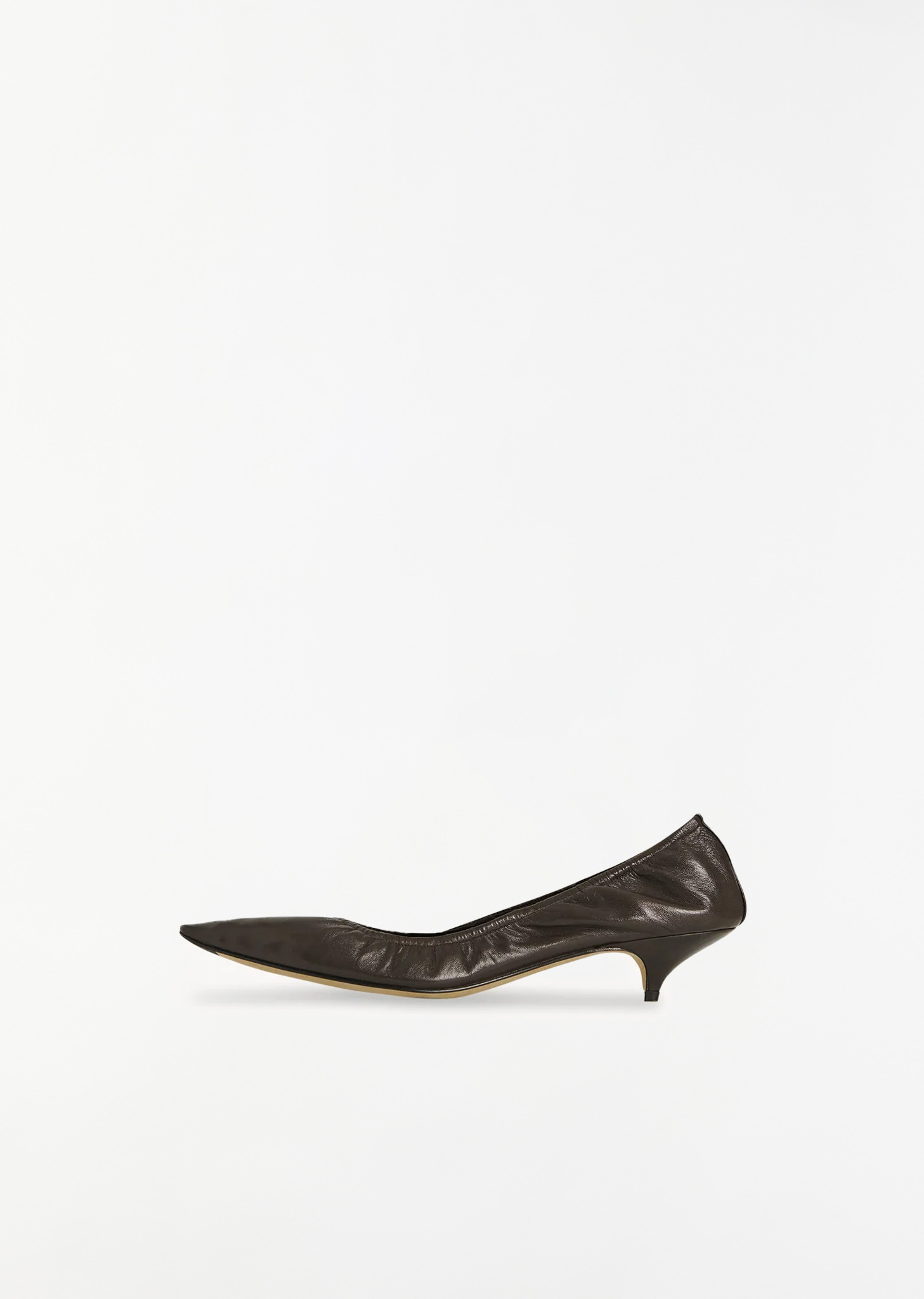 The Row brown kitten heel pump with a pointed toe, soft elastic trim, and leather sole in soft lambskin leather. Sizing: European (36-41). Color: Laquer Brown. Upper: 100% Soft Lambskin. Made in Italy. PS25TR023