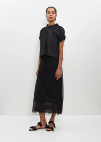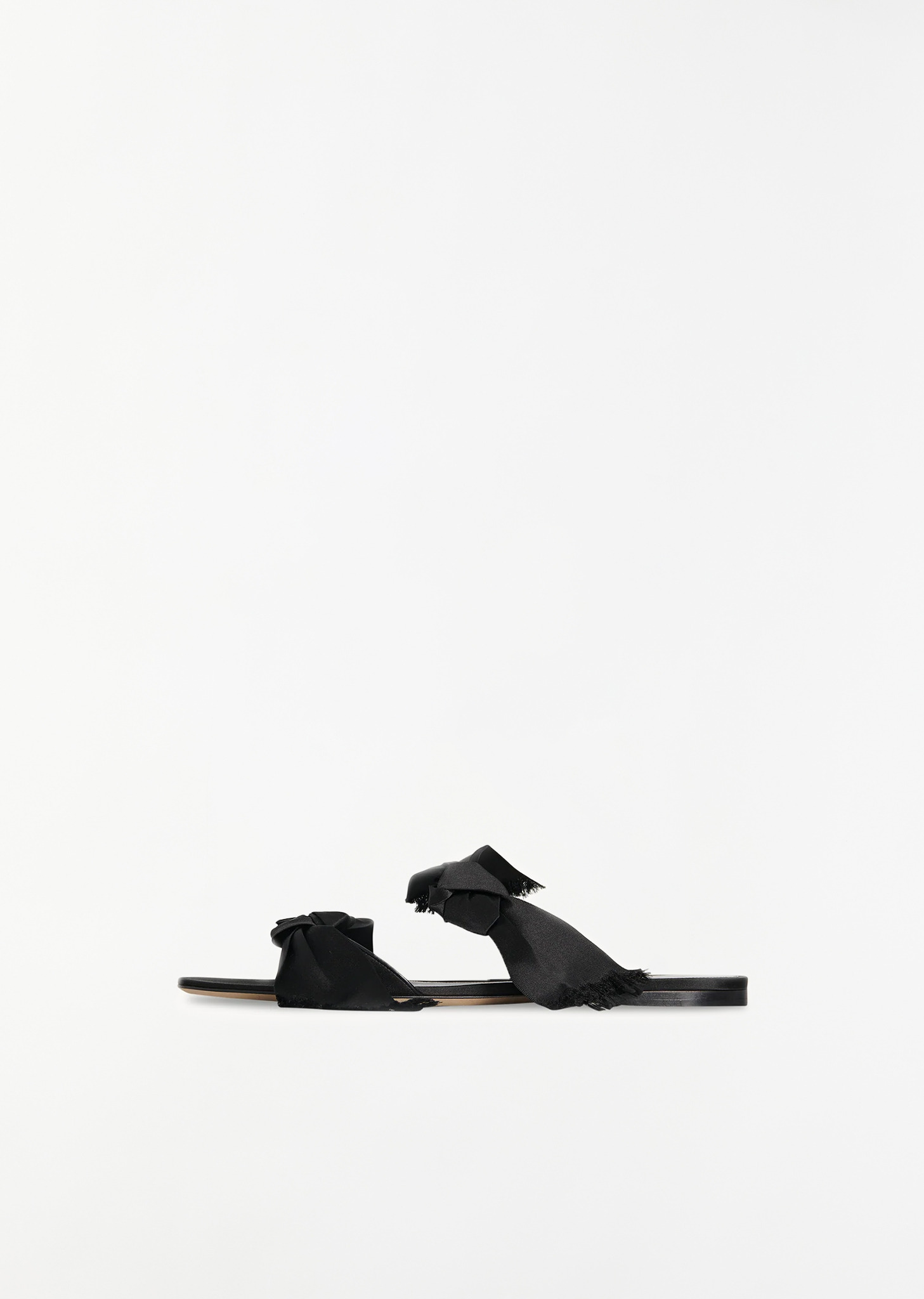 The Row black flat sandal with asymmetrical straps, raw-edge detailing, and leather sole in deconstructed silk satin. Sizing: European (36-41). Color: Black. Upper: 72% Viscose, 28% SIlk. Made in Italy. PS25TR030