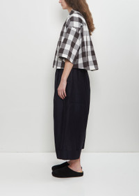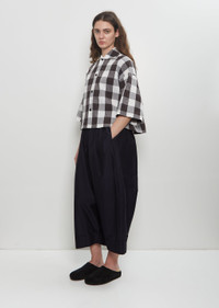 Toogood white and black gingham shirt crafted in cotton and metallic fiber blend with a crinkled effect. Features a soft folded camp collar, dropped shoulders, 3/4-length sleeves, an elongated curved back hem, side slits and a black buttons closure at front. Boxy fit. Worn with: The Baker Cotton Silk Trouser and Hugo Slide — Black . Sizing: Designer's unique sizing (0-3). 0=XS, 1=S, 2=M, 3=L. Avary is 5' 9.” (175cm), bust 31”, waist 23”, hips 34” and wears a size 1. Color: Tablecloth Gingham Coffee. 92% Cotton, 8% Metallic Fiber. Imported. SS25TG006