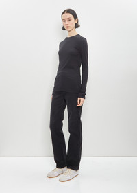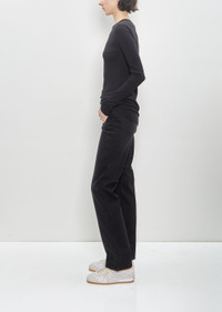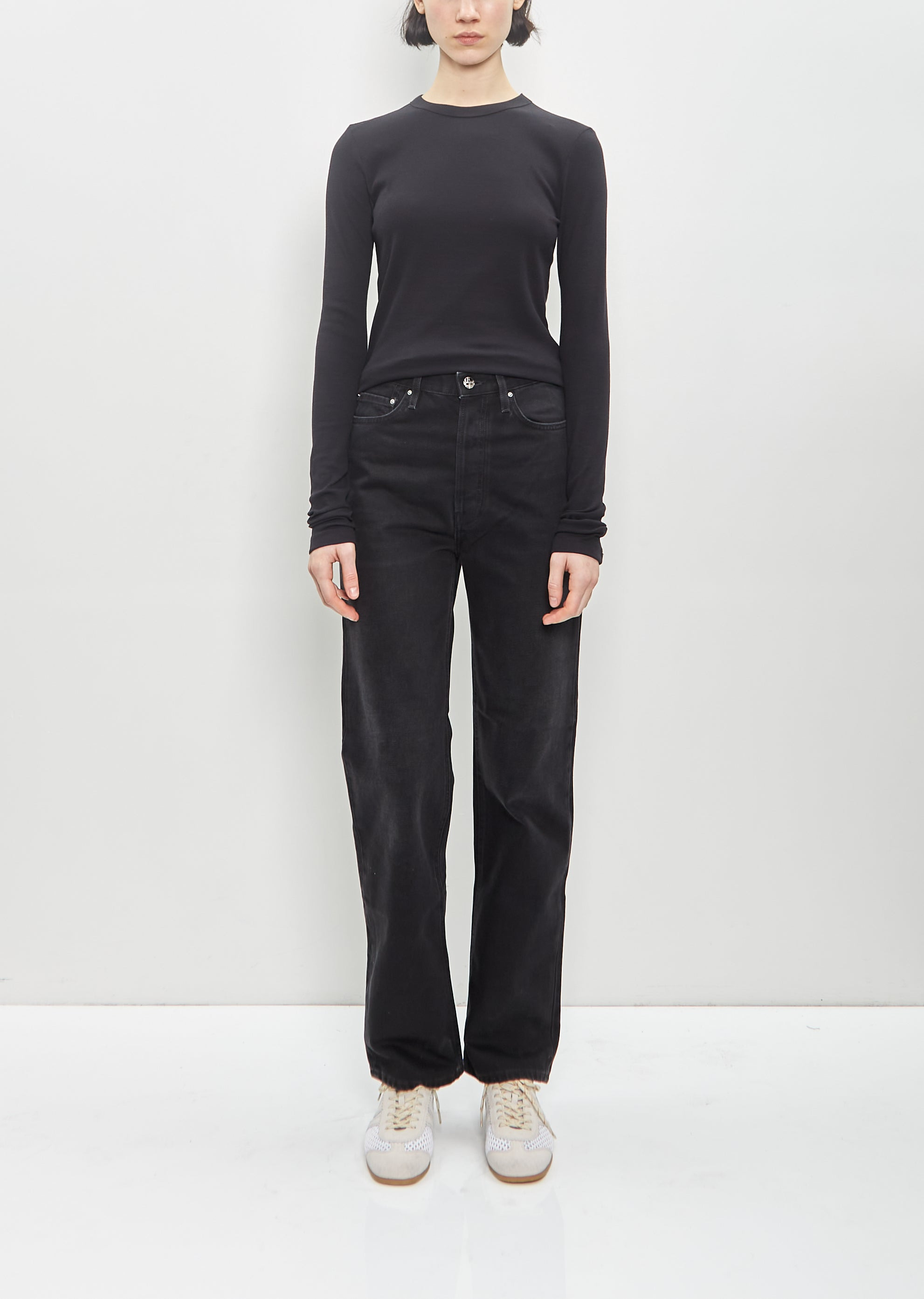 Toteme faded black classic cut denim in the full-length, with slim-to straight legs and mid-to-high waist made and washed in Italian organic cotton denim. Features a concealed button placket, belt loops, five pockets and a monogram-debossed leather patch. Sizing: Waist (24-29). In-seam: 34" Avie is 5'10” (178cm), bust 32”, waist 23”, hips 34” and wears a size 26. Color: Faded Black. 100% Organic Cotton. Made in Italy. FW24TO001