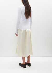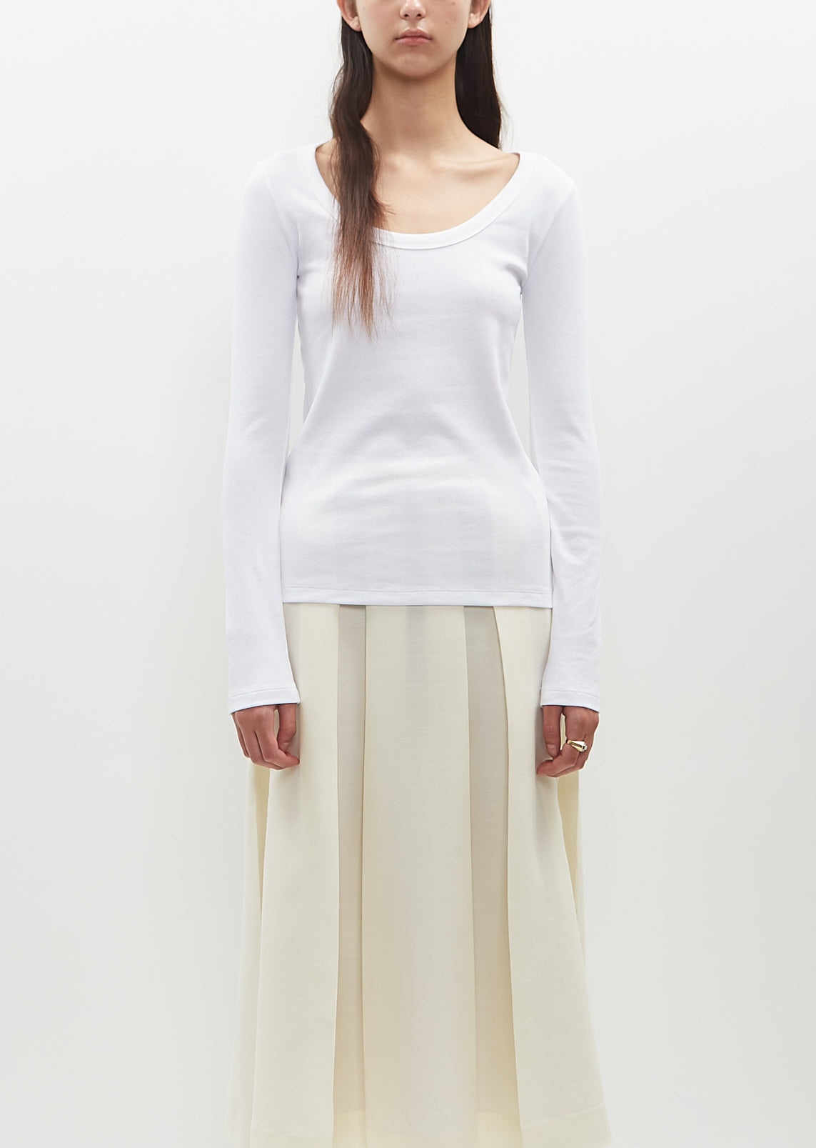 Toteme classic long sleeve top in white with a round scoop neck in a ribbed stretch cotton-blend jersey. Closer fit. Also available in: Charcoal Melange . Sizing: Universal (XXS-L). Delphine is 5’9” (175cm), bust 32", waist 24", hips 35" and wears a size small. Color: White. 95% Organic Cotton, 5% Elastane. Imported. PS25TO004