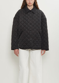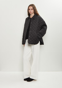 Toteme black jacket with a classic collar and tonal press button front in quilted polyester. Features dropped shoulders, angled welt pockets, and a curved hem. Sizing: European (32-40). 32=XXS, 34=XS, 36=S, 38=M, 40=L. Athena is 5'10” (178cm), bust 30”, waist 24.5”, hips 35” and wears a size 36. Color: Black. 100% Polyester. Imported. FW25TO009