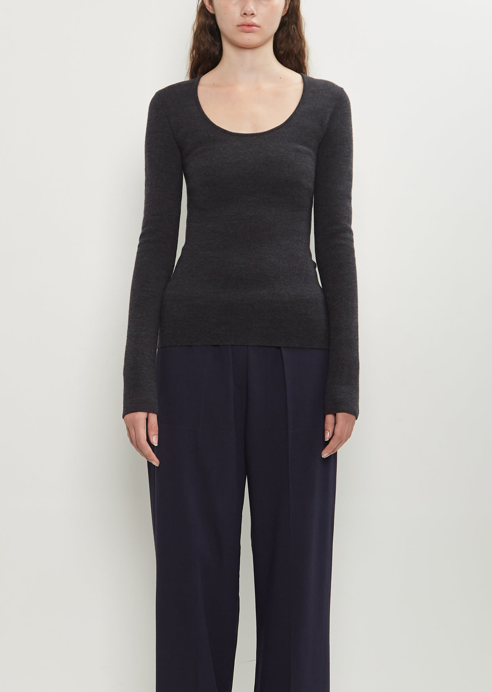 Toteme charcoal melange top with a scoop neckline in a warm and temperature-regulating merino blend knit . Features set-in sleeves, elongated torso, and ribbed trim finish at neckline. Closer fit. Sizing: Universal (XS-L). Athena is 5'10” (178cm), bust 30”, waist 24.5”, hips 35” and wears a size small. Color: Charcoal Melange. 95% Wool, 4% Polyamide, 1% Elastane. Imported. FW25TO007