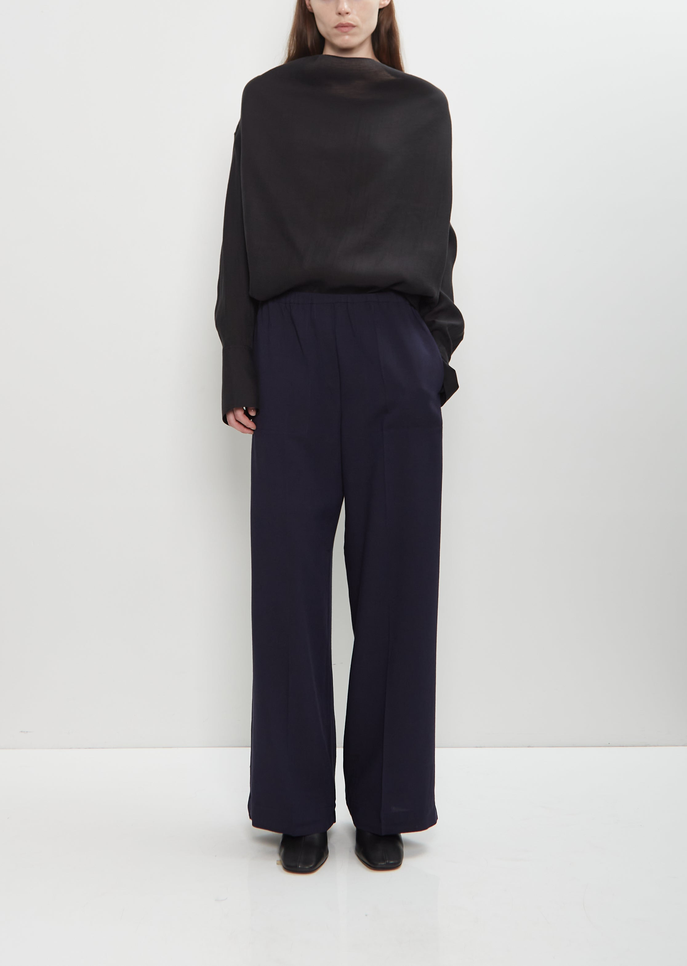 Toteme navy pull-on trousers with wide, straight legs and an elasticated waist in lightweight fluid canvas. Features a faux placket, pintuck details at legs, large front pockets, and patch pockets at back. Sizing: European (32-40). 32=XXS, 34=XS, 36=S, 38=M, 40=L. Coco is 5'9.5” (176.5cm), bust 31”, waist 24”, hips 35” and wears a size 36. Color: Navy. 90% Viscose, 10% Wool. Imported. FW25TO001