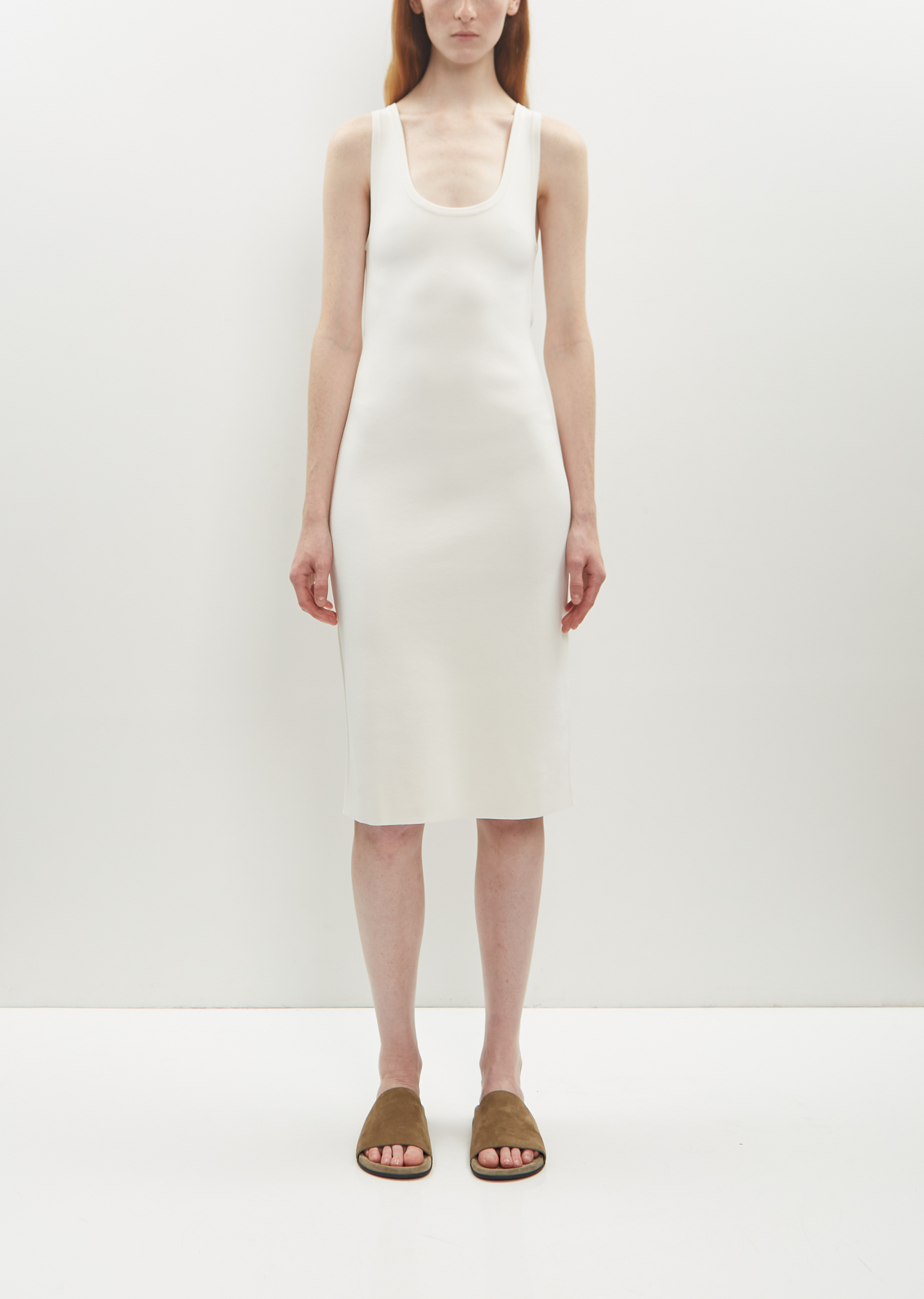 Toteme white pullover tank dress with a scoop neckline in a compact knit jersey. Features a straight hem and contrasting ribbed trim finish at neckline and armholes. Closer fit. Also available in: Black . Worn with: Hugh Slide — Military . Sizing: Universal (XS-L). Kate is 5'10” (178cm), bust 30”, waist 23.5”, hips 34” and wears a size small. Color: White. 53% Viscose, 45% Recycled Polyamide, 2% Elastane. Imported. PF25TO007
