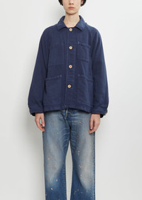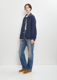 Visvim blue jacket with a spread collar and button front closure in a wool, linen and cotton blend twill with a faded and worn effect. Features raglan sleeves, a chest patch pocket, two front patch pockets, buttoned cuffs, and an interior chest patch pocket. Finished with branded light wood buttons throughout. Fully lined in a white satin rayon. Relaxed fit. Also available in: Black . Worn with: Rico Cotton Tee — Papiro , Social Sculpture Denim Jeans , and Suede Lace-Up Boots — Light Brown . Sizing: Designer's unique sizing (0-3). 0=XS, 1=S, 2=M, 3=L. Mila is 5' 9.5” (177cm) , bust 30”, waist 24”, hips 35” and wears a size 1. Color: Blue. 44% Wool, 30% Linen, 26% Cotton. Lining: 100% Rayon. Made in Japan. FW25VV009