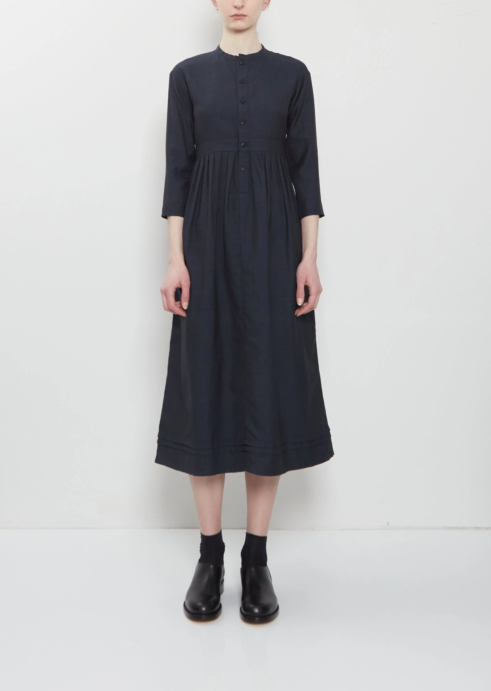 Visvim navy shirt dress with 3/4 length sleeves and a gathered waist in a lightweight wool, linen and silk blend twill. Features a round neckline, slightly dropped shoulders, concealed side seam pockets, a single patch pocket at back and a custom water buffalo buttons closure at front. Sizing: Designer's unique sizing (0 & 1). 0=XS, 1=S. Color: Navy. 75% Wool, 14% Linen, 11% Silk . Made in Japan . SS26VV013