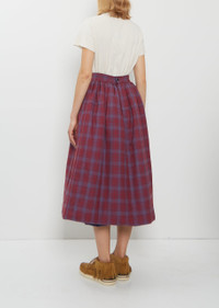 Visvim red and navy A-line padded skirt with adjustable buttoned waistline in wool and linen blend twill filled with goose down. Features a gathered waist, concealed angled pockets and water buffalo buttons closure at back. Fully lined in navy wool and linen blend. Sizing: Designer's unique sizing (0-3). 0=XS, 1=S, 2=M, 3=L. Alina is 5' 9” (175cm), bust 31”, waist 23", hips 34”. Color: Red. 86% Wool, 14% Linen. Filling: 100% Goose Down. Made in Japan. FW25VV006