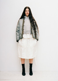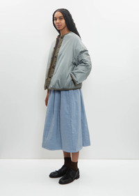 Visvim beige reversible padded liner jacket in wool and linen blend jacquard on one side and light green nylon twill on reverse side filled with down and feathers. Features a round neckline, dropped shoulders, side seam pockets on both sides, buttoned cuffs, and a loop and c ustom water buffalo buttons fastening at front. Also available in: Brown . Worn with: Cotton Mini Boy Tee — Bark , Wool Linen Elevation Sashinko Down Skirt and Classic Derby . Sizing: Designer's unique sizing (00-2). 00=XS, 0=S, 1=M, 2=L. Elena is 5' 9.5” (177cm), bust 32”, waist 25”, hips 34” and wears a size 0. Color: Beige. 49% Wool, 44% Linen, 7% Cotton. Lining: 100% Nylon. Filling: 93% White Goose Down, 7% Feather. Made in Japan. SS25VV012