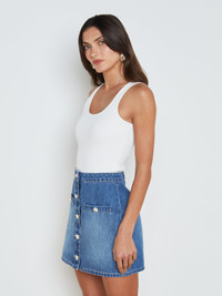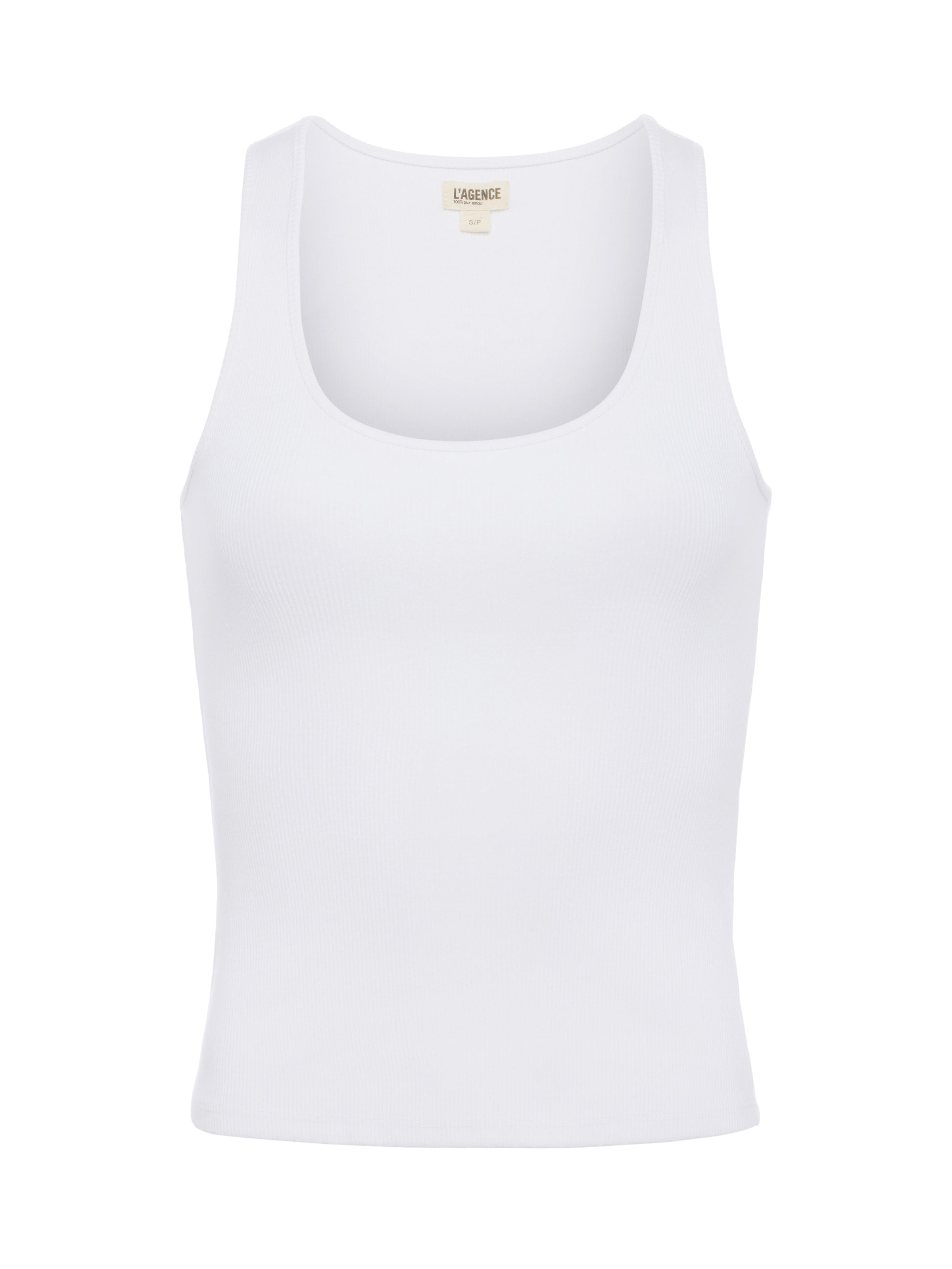 The essential white tank, perfected. Our Adira strikes an elegant modern tone with a sultry deep scoopneck and slim fit, now in the color trend of the season. • Soft ribbed knit • Slim fit • Deep scoopneck Style No. 5788CMR-WHIT DETAILS & FIT - Model Details: Height 5'10" | Bust 32" | Waist 24'' | Hips 34.5'' | Wearing Size XS - About 21" From Shoulder to Hem MATERIALS & CARE Composition - 47% Cotton 47% Modal 6% Spandex - Made in Los Angeles Care - Hand wash