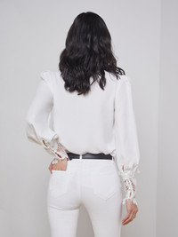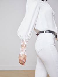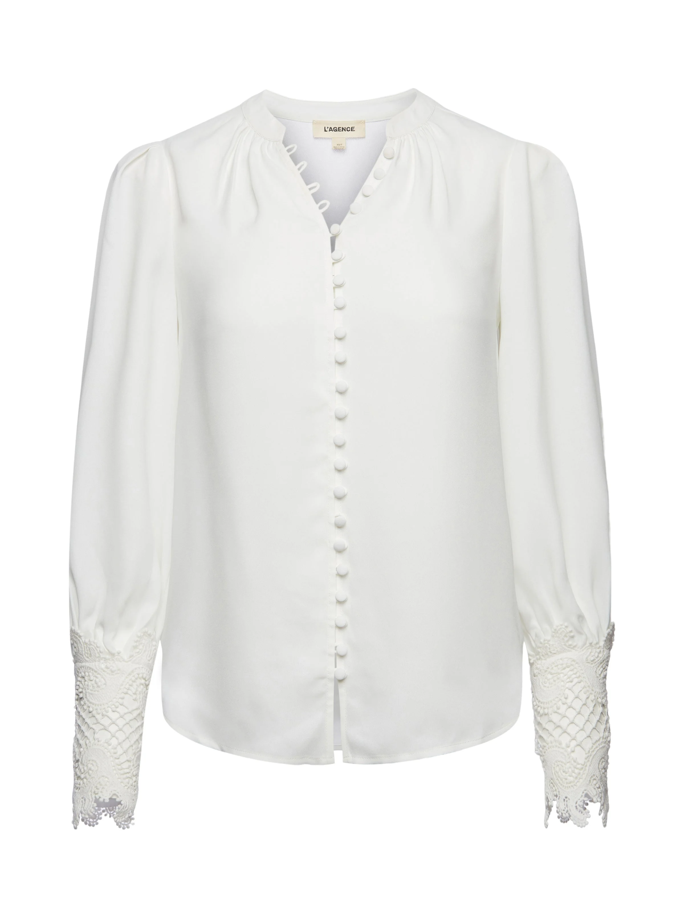 A sublimely chic blouse in ivory. Features vintage-inspired self-button-loop closure and extended cuffs done in exquisite scalloped guipure lace. Relaxed high-low silhouette gathered into band collar. Long sleeves with pleated caps. Front button closure. Style No. 40411PYT-IVOR DETAILS & FIT - Model Details: Height: 5’10" | Bust 34” | Waist 24" | Hips 35” | Wearing Size XS - About 25" From Shoulder to Hem - Sleeve Length: 26" MATERIALS & CARE Composition - 100% Polyester - Imported Care - Dry clean only - Do not wash - No bleach - No tumble dry - Low iron if needed