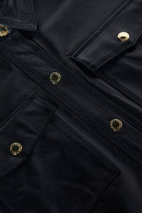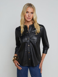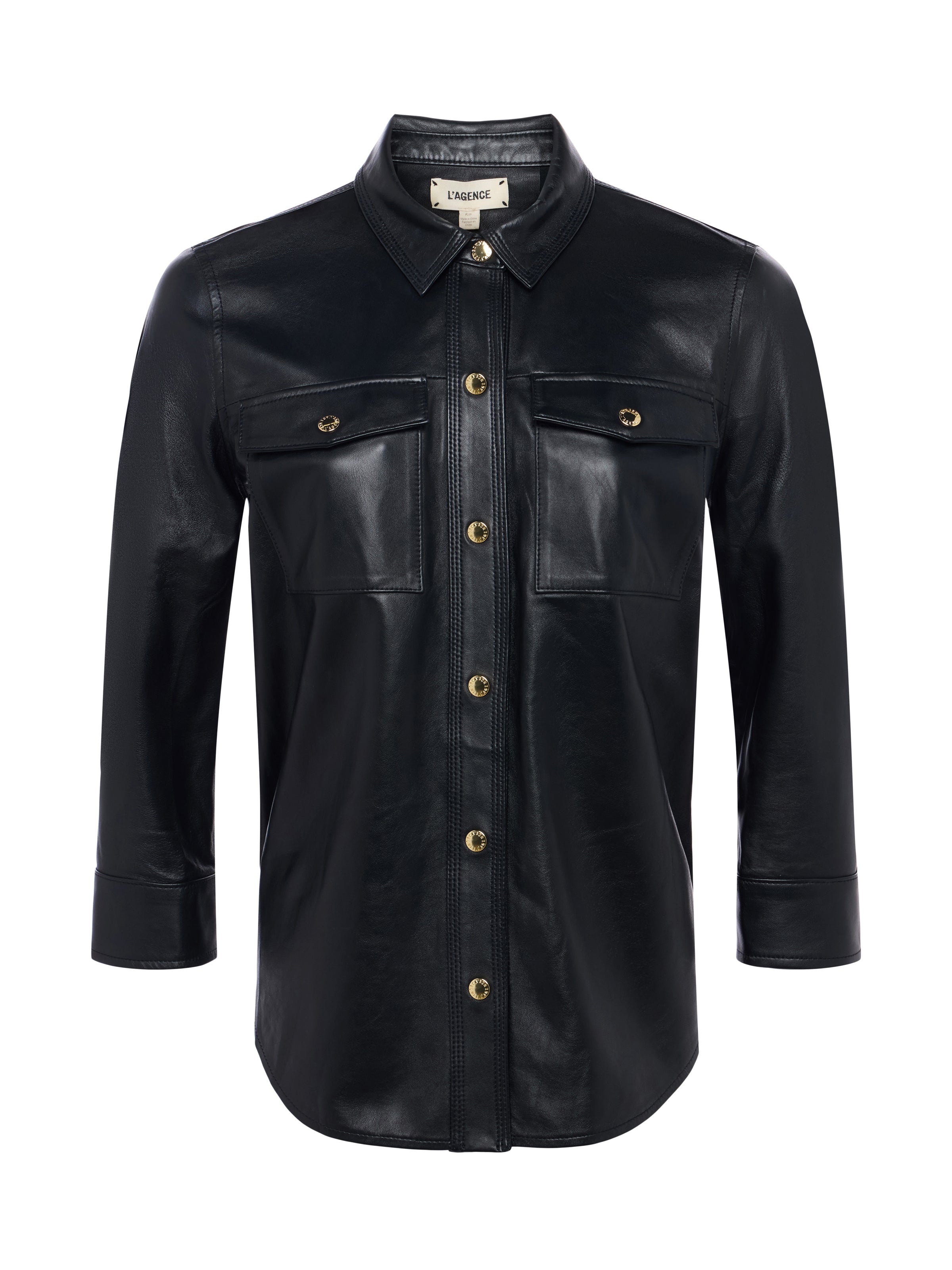 Meet your new hero piece, in supple, lightweight leather. Three quarter sleeves and gold snap buttons add a feminine twist. Wear it as a top or second layer now and forever. • 100% lightweight lambskin leather • Flap pockets • Gold L’AGENCE snap buttons • Three-quarter sleeves • Shirttail hem Style No. 40712TLL-BLAC DETAILS & FIT - Model Details: Height 5'9" | Bust 32" | Waist 24" | Hips 34" | Wearing Size XS - About 26.4" From Shoulder to Hem - Sleeve Length: 19" MATERIALS & CARE Composition - 100% Lambskin - Imported