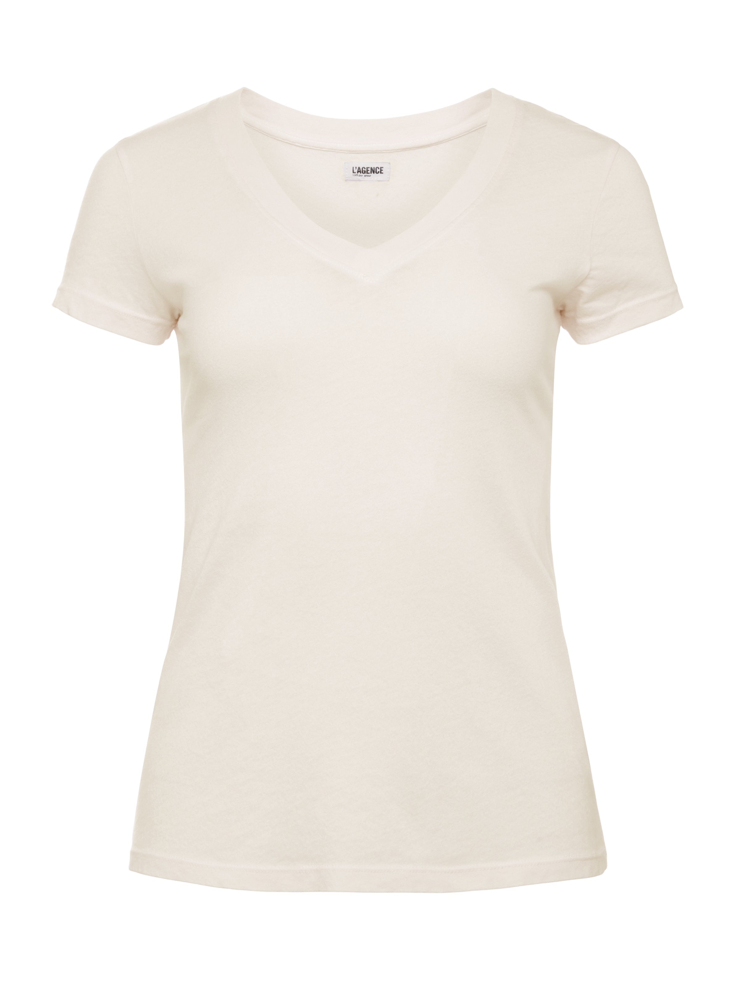 A quintessential v-neck tee in a vintage off-white. Classic v-neckline, clean short sleeves, and a slim, yet effortless fit. Becca is a wardrobe staple, and can be worn alone or as the perfect base layer. Lightweight, super-soft, and 100% Cotton. Style No. 5485DCJ-VIWH DETAILS & FIT - Model Details: Height 5’10.5" | Bust 33" | Waist 24" | Hips 34" | Wearing Size 25 - About 23.5" From Shoulder to Hem - Sleeve Length: 4" MATERIALS & CARE Composition - 100% Cotton - Made in Los Angeles Care - Hand wash