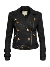 Biker style meets feminine elegance. Chic, blazer-inspired details like embossed gold buttons and peaked lapels elevate this black leather jacket, crafted from 100% luxury lambskin. Classic biker elements like an attached leather belt, zippers, straps, and a chunky belt maintain an edgy authenticity. *Slim fit through the arms, size up if you plan to layer* Style No. 1599VSLA-BLAC DETAILS & FIT - Model Details: Height: 5’10" | Bust 34” | Waist 24" | Hips 35” | Wearing Size XS - About 21" From Shoulder to Hem - Sleeve Length: 24" MATERIALS & CARE Composition - 100% Leather - Imported