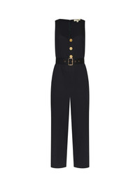 The Branca jumpsuit is a versatile piece you'll wear on repeat. Featuring coin buttons and a belted waist, this stretch-cotton style is the solution for days that go from desk to drinks. • Crisp cotton poplin • Lion head buttons • Side pockets • Invisible back zip Style No. 7145LCN-BLAC DETAILS & FIT - Model Details: Height 5'9" | Bust 32" | Waist 24" | Hips 34" | Wearing Size XS - Inseam: 27" - Leg Opening: 9.5" MATERIALS & CARE Composition - 62% Cotton 35% Nylon 3% Spandex - Imported