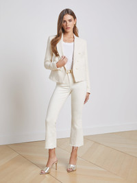An essential open front blazer in a richly textured cotton in neutral ecru-white. Smartly tailored design features strong shoulders, sharp peaked lapels, and sleek welt pockets. Seaming details add subtle, feminine shape. Includes six tonal embossed-dome accent buttons as accents. Fully lined. *This item may run big. We encourage sizing down.* Style No. 1626FQP-ECRU DETAILS & FIT - Model Details: 5’9" | Bust: 33" | Waist: 23" | Hips: 34" | Wearing a Size 2 - About 22.75" From Shoulder to Hem - Sleeve Length: 24.5" MATERIALS & CARE Composition - 90% Cotton, 10% Polyester - Imported