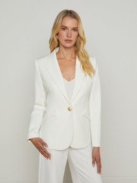 The ultimate single-breasted blazer, now in white. • Midweight stretch suiting fabric • Shoulder pads • Flap pockets • Embossed dome button closure Style No. 1377NGX-WHIT DETAILS & FIT - Model Details: Height 5'9" | Bust 32" | Waist 24" | Hips 34" | Wearing Size 2 - About 27.25" From Shoulder to Hem - Sleeve Length: 24.8" MATERIALS & CARE Composition - 68% Polyester 29% Rayon 3% Spandex - Imported