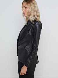 An exquisite single-breasted blazer in supple black leather. The chic design is defined by strong shoulders, sartorial peaked lapels, angled flap pockets, and expertly handled seaming that accentuates the hourglass shape. The bespoke statement look fastens in front with a single embossed tonal button. Fully lined. 100% Leather. Style No. 1377MLL-BLAC DETAILS & FIT - Model Details: Height 5’10 | Bust 34” | Waist 24" | Hips 34” | Wearing Size 2 - About 26.75" From Shoulder to Hem - Sleeve Length: 24.75" MATERIALS & CARE Composition - 100% Lambskin - Imported Care - Dry clean only - Do not wash - No bleach - No tumble dry