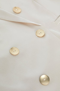 Subtle feminine shaping balances the crisp tailored details of the timeless double-breasted Colin blazer. Now back in a luxe champagne silk. • 100% silk charmeuse • Fully lined • Strong shoulders • Welt pockets • Back vent Style No. S1485CHM-CHMP DETAILS & FIT - Model Details: Height 5'9" | Bust 30" | Waist 24" | Hips 34" | Wearing Size 2 - About 26.75" From Shoulder to Hem - Sleeve Length: 24.6" MATERIALS & CARE Composition - 100% Silk - Imported Care - Dry clean only - Do not wash - No bleach - No tumble dry - Low iron if needed