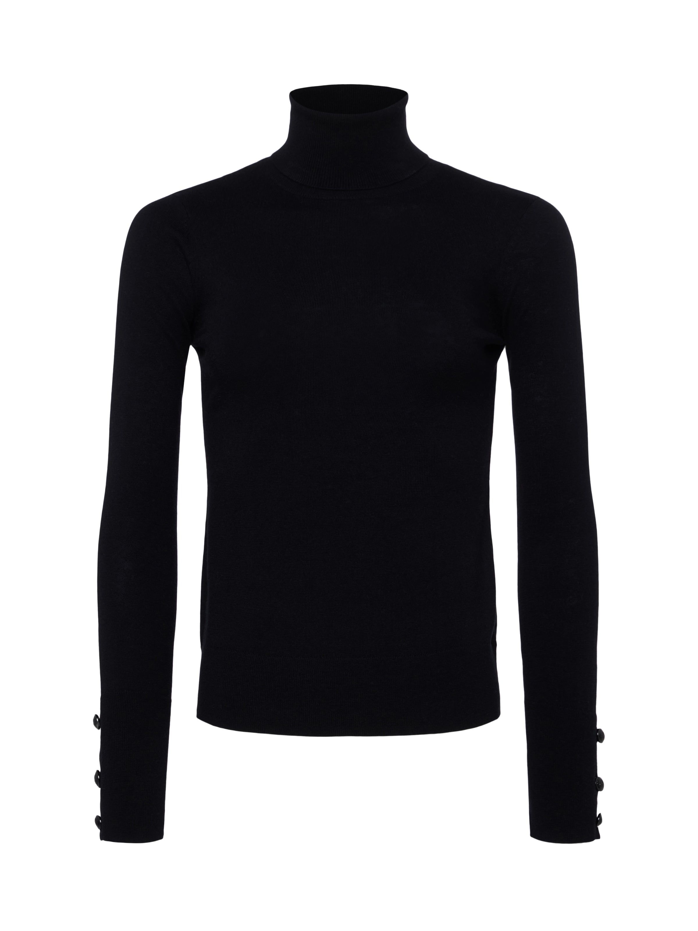 An essential turtleneck in black. Lightweight premium silk-infused knit with a wearable soft hand. Slim-fit style falls to high hip and includes long sleeves with black embossed-dome accent buttons on extended cuffs. Style No. 8865PSO-BLBL DETAILS & FIT - Model Details: Height 5'10" | Bust 32" | Waist 24'' | Hips 34.5'' | Wearing Size XS - About 22.5" From Shoulder to Hem - Sleeve Length: 24.25" MATERIALS & CARE Composition - 66% Cotton 24% Nylon 10% Silk - Imported Care - Hand wash - Cold water - Do not dry clean - No bleach - Lay flat to dry - No tumble dry - Cool iron on reverse when needed