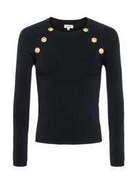 The quintessential crewneck, with a hint of glamour. • Lightweight stretch knit fabric • Strong shoulders • Raglan sleeves • No closures • Decorative embossed dome buttons Style No. 80022NXC-BLGO DETAILS & FIT - Model Details: Height 5'10" | Bust 32" | Waist 24'' | Hips 34.5'' | Wearing Size XS - About 21.5" From Shoulder to Hem - Sleeve Length: 28" MATERIALS & CARE Composition - 60% Rayon 38% Nylon 2% Spandex - Imported Care - Dry clean only