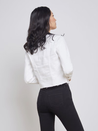A white denim jacket with a feminine fit and an ultra-soft feel. Luxurious stretch denim hugs the body while allowing complete freedom of movement. Timeless design features a classic collar, double chest pockets, and a front button closure. Slimming tapered seams and a raw, ravaged hem add a modern edge. Style No. 1431KBO-BLAN DETAILS & FIT - Model Details: Height: 5’10" | Bust 34” | Waist 24" | Hips 35” | Wearing Size XS - About 20.5" From Shoulder to Hem - Sleeve Length: 22" MATERIALS & CARE Composition - 98% Cotton, 2% Polyurathane - Made in Los Angeles Care - Machine wash