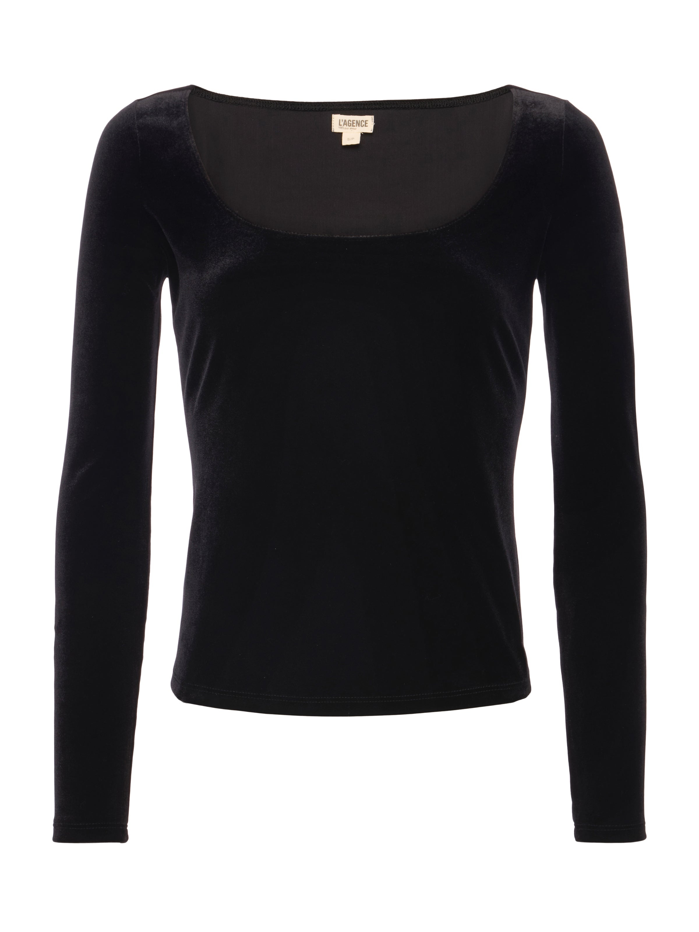 A ballet-inspired wide U-neck adds understated elegance to the Jelena top. • Stretch velvet • Slim fit • Wide U-neck Size tip: If you prefer a more relaxed fit through the arms, we recommend sizing up. Style No. 5794FUW-BLAC DETAILS & FIT - Model Details: Height 5'10" | Bust 32" | Waist 24" | Hips 34.5" | Wearing Size XS - About 22" From Shoulder to Hem - Sleeve Length: 24" MATERIALS & CARE Composition - 90% Polyester 10% Spandex - Made in Los Angeles