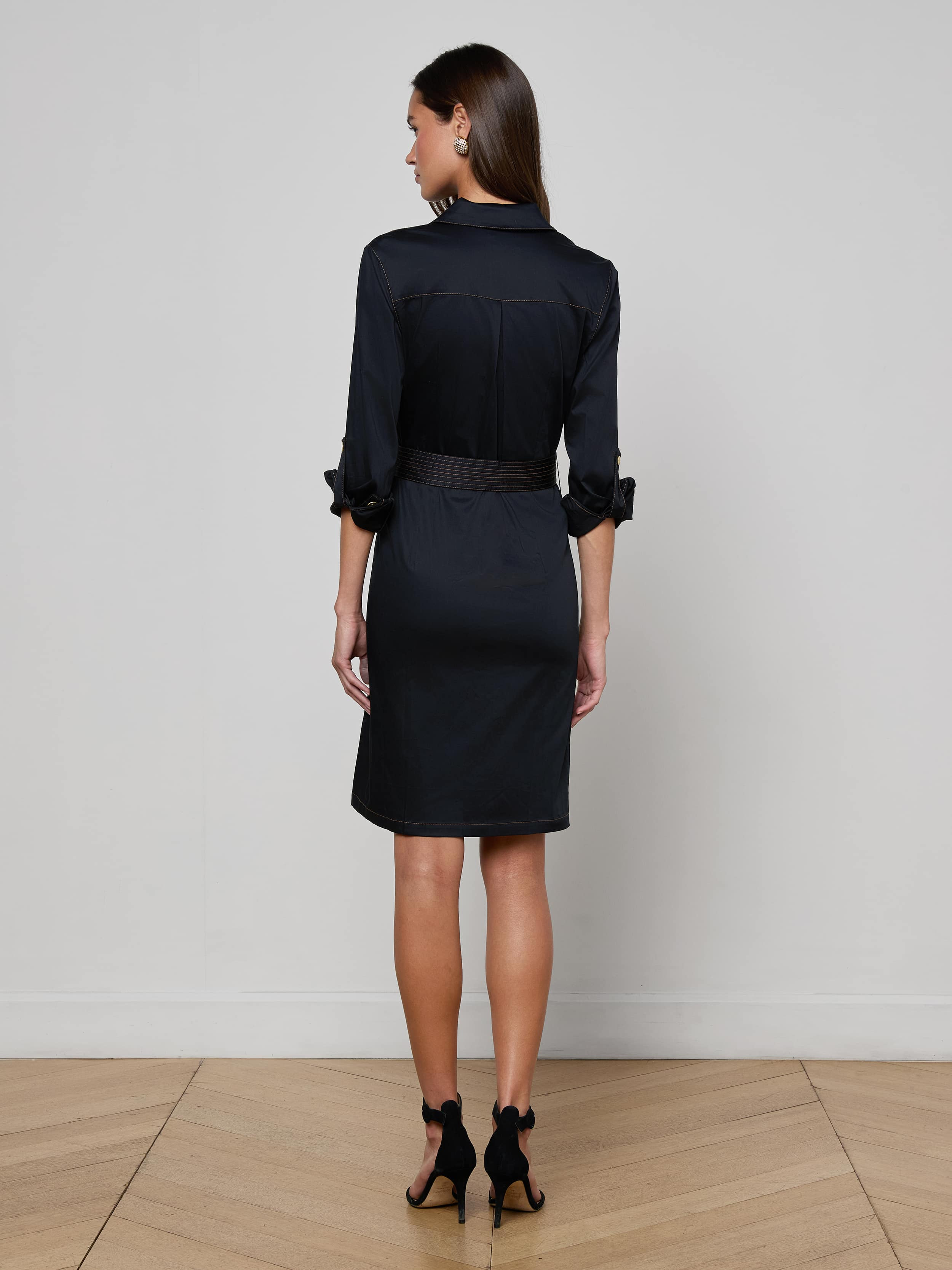 Introducing our poplin cargo dress—perfect for every daytime excursion, from coffee runs to client meetings. • Cotton poplin • Roll tab sleeves • Flap pockets • Adjustable belt Style No. 61512FVT-BLAC DETAILS & FIT - About 39.25" From Shoulder to Hem - Sleeve Length: 22.5" MATERIALS & CARE Composition - 97% Cotton 3% Spandex - Imported Care - Dry clean only - Do not wash - No bleach - No tumble dry - Low iron if needed
