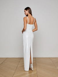 Make an entrance with the Karma. A sexy, structured bodice meets light-catching white sequins for a body-skimming statement in this sophisticated stunner made for special moments. • Allover sequins • Lined • Invisible back zip • Back slit Style No. 61442REO-WHAS DETAILS & FIT - Model Details: Height 5'10" | Bust 32" | Waist 23.5" | Hips 34.5" | Wearing Size 2 - About 55.25" From Shoulder to Hem MATERIALS & CARE Composition - 100% Polyester - Imported Care - Spot clean only - No dry clean