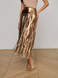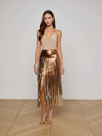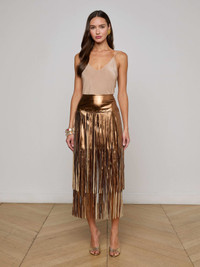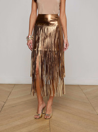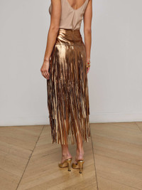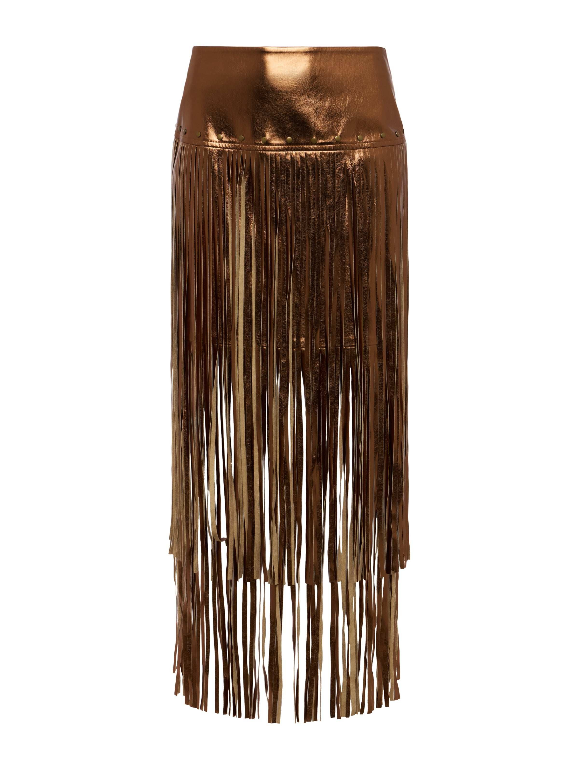 The Karolina statement skirt turns heads with every step—crafted in bronze vegan leather, it features tiered fringe for dramatic movement and studded detailing for extra edge. • Metallic vegan leather • Invisible back zip Style No. 3442MST-METG DETAILS & FIT - Model Details: Height 5'10" | Bust 32" | Waist 23.5" | Hips 34.5" | Wearing Size 2 - About 16" From Waist to Hem - About 39.5" From Waist to Hem, including Fringe MATERIALS & CARE Composition - 50% Polyurethane 50% Polyester - Imported Care - Hand wash gentle in cold water - Do not tumble dry - Do not bleach - Do not wring - Cool iron if needed