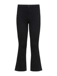 A high-rise cropped flare jean in a premium denim with a saturated black hue. Design hugs from waistband to knee before extending into a flared cropped leg finished with raw hem. Includes five-pocket construction and front zip fly closure with tonal button. Style No. 2651ISK-BLAC DETAILS & FIT - Model Details: Height: 5’10" | Bust 34” | Waist 24" | Hips 35” | Wearing Size 25 - Rise: 9.5” - Inseam: 26” - Leg Opening: 17” MATERIALS & CARE Composition - 93% Cotton 6% Polyester 1% Spandex - Made in Los Angeles Care - Machine wash