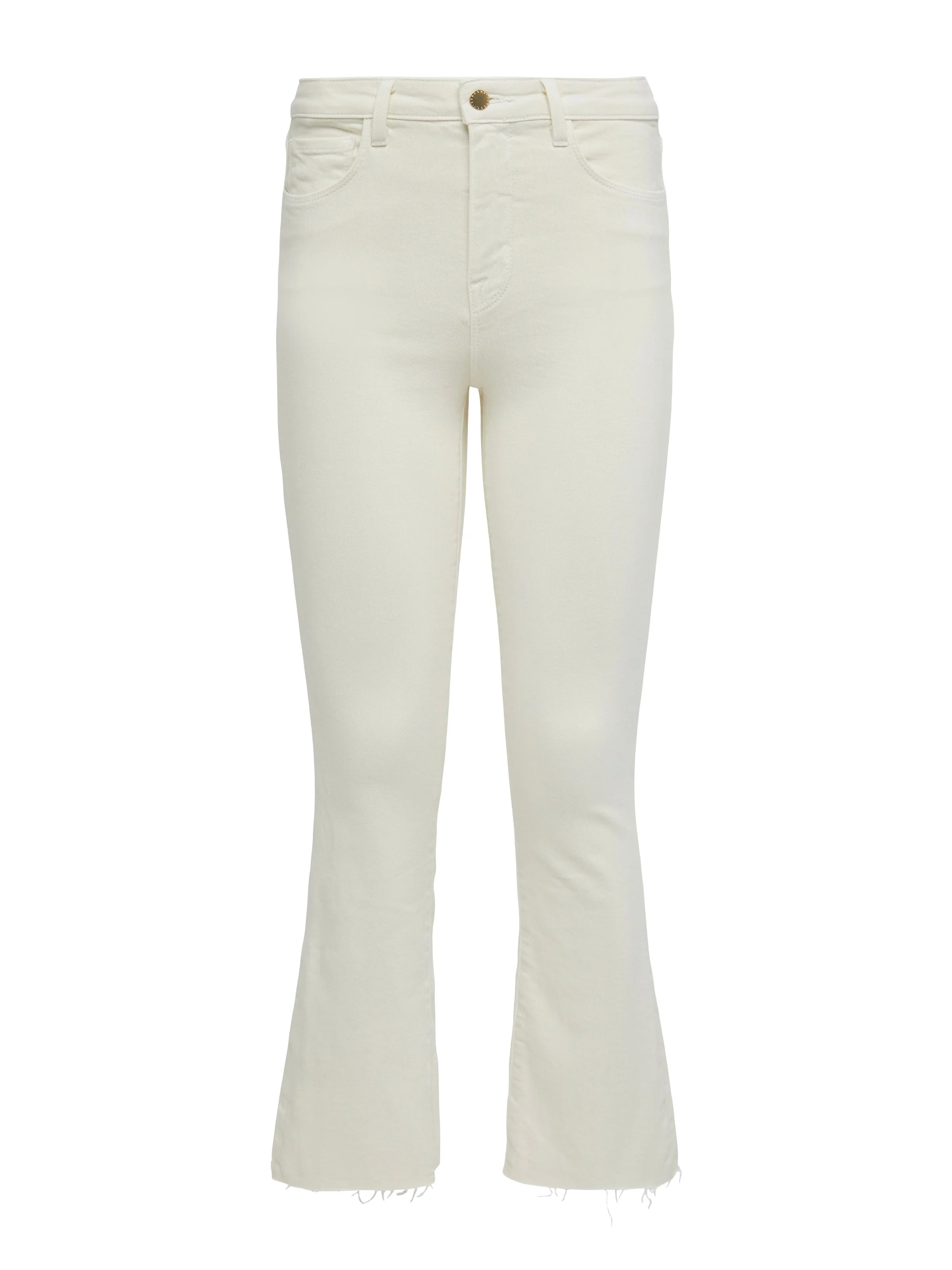 A high-rise cropped flare jean in a premium stretch denim and vintage-white hue. Style hugs from waistband to knee before extending into a flared cropped leg finished with a clean raw hem. Includes five-pocket construction and front zip fly closure. Style No. 2651ISK-VIWH DETAILS & FIT - Model Details: Height: 5' 8'’ | Bust 32” | Waist 23" | Hips 34” | Wearing Size 25 - Rise: 9.5" - Inseam: 26" - Leg Opening: 12.75" MATERIALS & CARE Composition - 93% Cotton, 6% Polyester, 1% Spandex - Made in Los Angeles Care - Machine wash