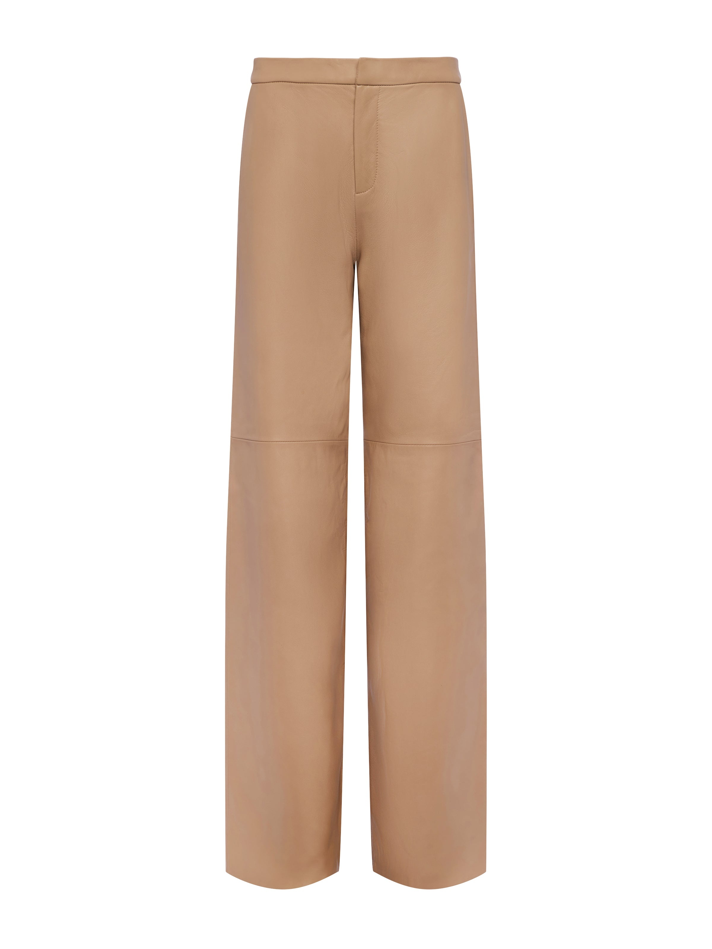 The L’AGENCE favorite straight-leg trouser, fitted through the hips and relaxed through the leg. Now in a luxurious lightweight leather. • 100% lambskin leather • High rise wide straight-leg • Side and back welt pockets • Hidden hook-and-bar closure • 34" inseam Style No. 2819MLL2-CAPU DETAILS & FIT - Model Details: Height 5'9" | Bust 30" | Waist 24" | Hips 34" | Wearing Size 2 - Rise: 11" - Inseam: 34" - Leg Opening: 11.4" MATERIALS & CARE Composition - 100% Lambskin - Imported Care - Dry clean by leather specialist only