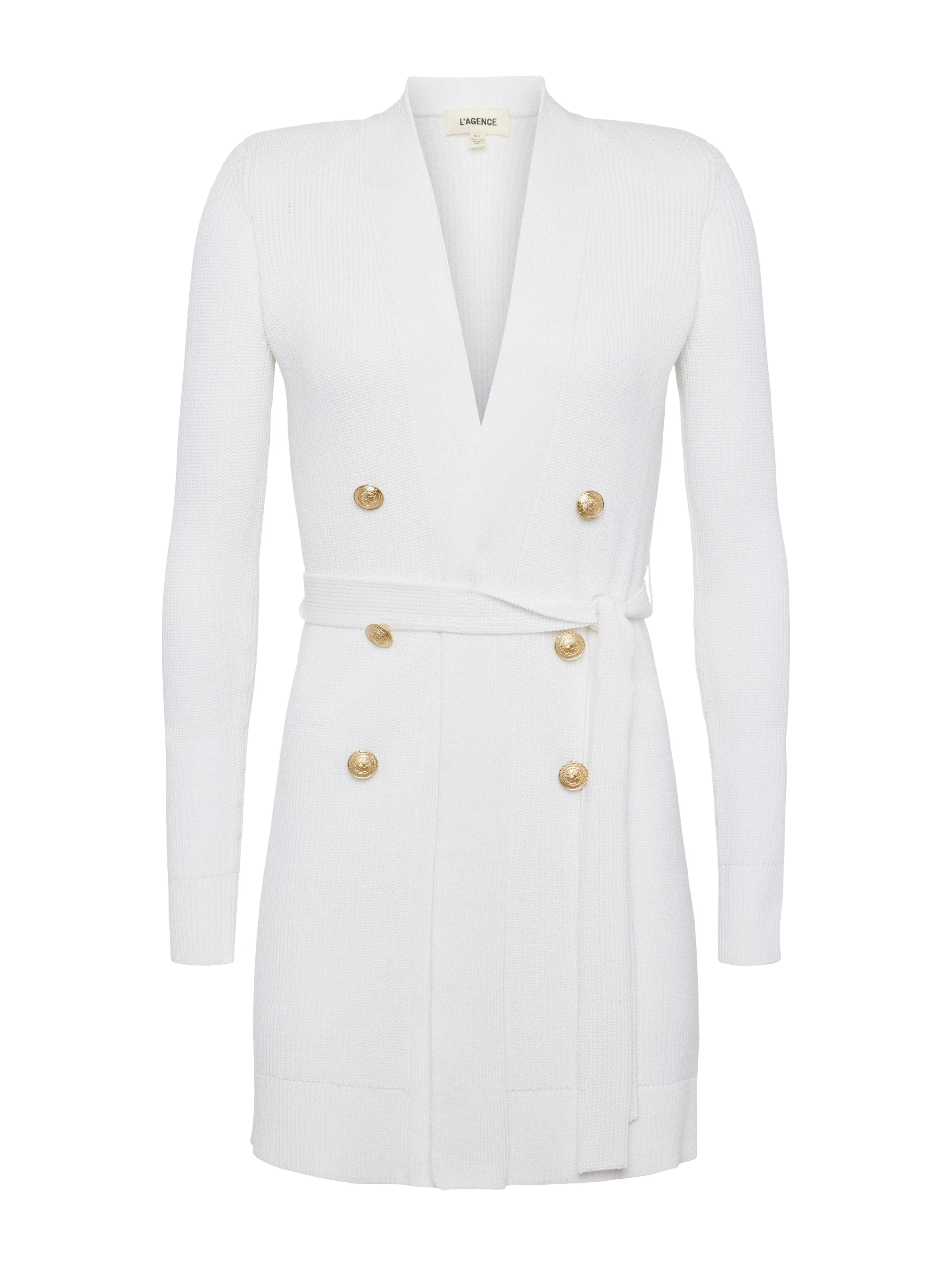 Effortlessly chic and ultra-wearable, she's our bestselling rib-knit cardigan, and now offered in pure white with a hint of lurex. Our double-breasted Noe tapers from strong shoulder to waist before falling to mid-thigh, for a flattering, defined silhouette. Tie belt enhances hourglass definition. Finished with our signature embossed-dome accent buttons. Pair with denim for a pulled-together weekend look. Style No. 8578NXT2-WHIT DETAILS & FIT - Model Details: Height 5'10" | Bust 32" | Waist 24'' | Hips 34.5'' | Wearing Size XS - About 32" From Shoulder to Hem - Sleeve Length: 23.5" MATERIALS & CARE Composition - 74% Rayon 24% Polyester 2% Metallic - Imported Care - Hand wash with like colors - Do not bleach - Low iron if needed or dry clean