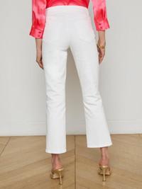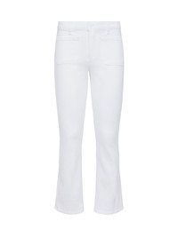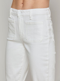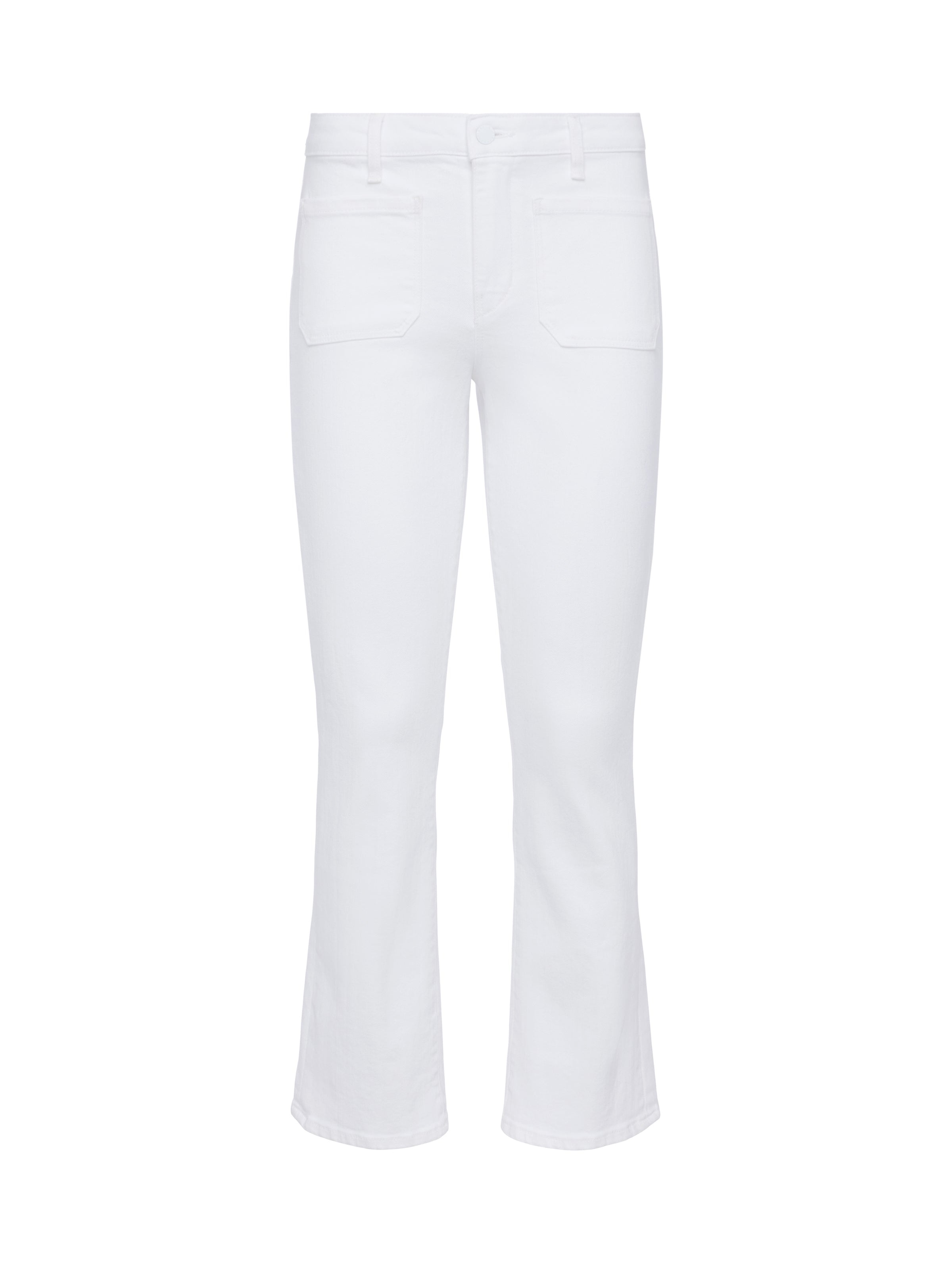 An easy slim flare jean with the look of a trouser. Patch pockets add a subtle retro appeal. Now in white. • Subtle stretch denim • High rise • Front and back patch pockets • Zip fly and button closure Style No. 2970KBO-BLAN DETAILS & FIT - Model Details: Height 5'9" | Bust 32" | Waist 24" | Hips 34" | Wearing Size 25 - Rise: 10.25" - Inseam: 33" - Leg Opening: 20" MATERIALS & CARE Composition - 98% Cotton 2% Spandex - Made in Los Angeles Care - Machine wash