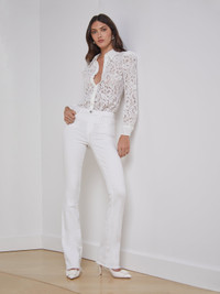 A classic high-rise jean in premium stretch denim and a bright-white hue. With a flattering contoured waistband, style is fitted through hip and thigh before falling in a straight, slim leg to a clean raw hem. Includes 5-pocket construction and front zip fly closure. Style No. 2649ISKR-BLAN DETAILS & FIT - Model Details: 5’9" | Bust: 33" | Waist: 23" | Hips: 34" | Wearing a Size 25 - Rise: 9.5“ - Inseam: 34“ - Leg Opening: 17“ MATERIALS & CARE Composition - 93% Cotton, 6% Polyester, 1% Spandex - Made in Los Angeles Care - Machine wash