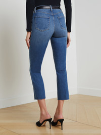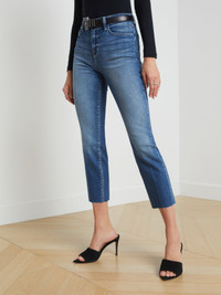 An indispensable high-rise cropped jean in medium blue premium stretch denim with meticulous sanding on hip, thigh, and seat for an authentic weathered look. With classic five-pocket construction, style also includes slim straight leg finished with clean raw hem. Zip fly closure. Style No. 2520BLDR-CMBR DETAILS & FIT - Model Details: Height:: 5'10" | Bust: 32" | Waist: 24'' | Hips: 34.5'' | Wearing Size 25 - Rise: 9.25" - Inseam: 26" - Leg Opening: 12.75 MATERIALS & CARE Composition - 79% Cotton 20% Repreve Polyester 1% Spandex - Made in Los Angeles Care - Machine wash