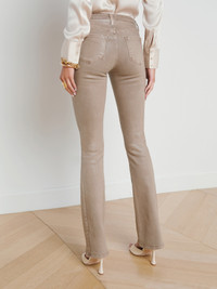 A sleek, slim bootcut, fitted through the hips and knee. A contoured waistband securely hugs the natural waist without gaping. Now offered in a neutral leather-look coated denim. • Super-stretch coated denim • High-rise baby bootcut • Faux front pockets • Functional back pockets • Zip fly and button closure • 34" inseam Style No. 2700PDDC-RYEC DETAILS & FIT - Model Details: Height 5’9.5" | Bust 32" | Waist 24" | Hips 35" | Shoe 8 | Wearing Size 25 - Rise: 9.75" - Inseam: 34" - Leg Opening: 17.5" MATERIALS & CARE Composition - 86% Cotton 11% Elastane 3% Spandex - Made in Los Angeles Care - Spot wash disinfect - Dry clean only