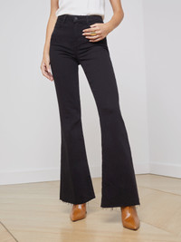 A beautifully proportioned flare-leg jean in true-black premium stretch denim. With a secure-fitting contoured waistband, style hugs from natural waist to knee before draping into a flared leg with raw hem finish. 32" inseam perfect for wearing a sneaker or ideal length for average height fit. Classic five-pocket construction and zip-fly closure. Style No. 2807CSNR-SABL DETAILS & FIT - Model Details: Height: 5' 8'’ | Bust 32” | Waist 23" | Hips 34” | Wearing Size 25 - Rise: 9.5" - Inseam: 32" - Leg Opening: 22" MATERIALS & CARE Composition - 88% Cotton 11% Polyester 1% Spandex - Made in Los Angeles Care - Machine wash