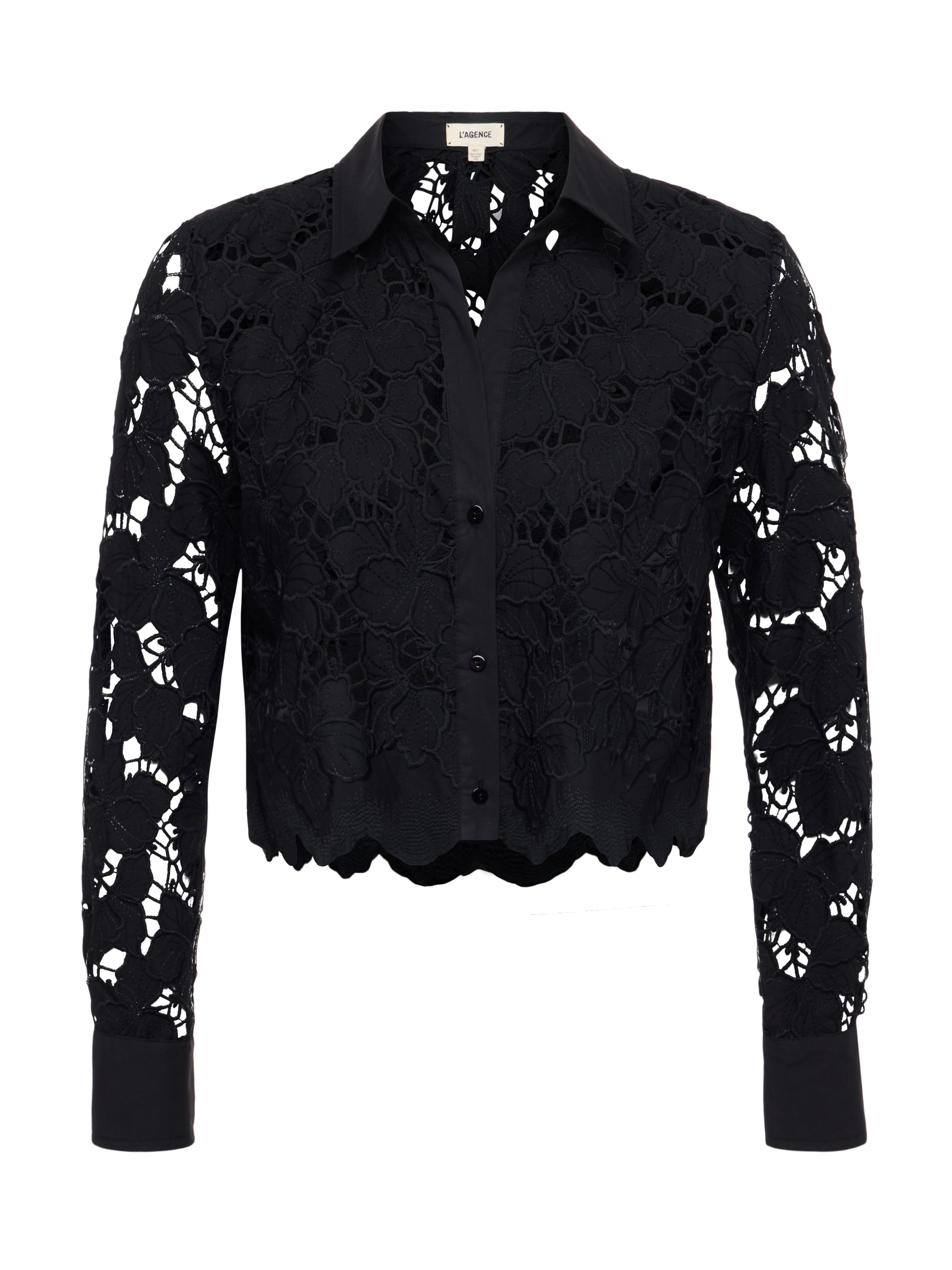 Our modern spin on a lace blouse, the Seychelle delivers classic shirting details in a cool cropped cut. Now in black. • Poplin lace • Relaxed fit • Scalloped hem • Unlined • Front button closures Style No. 40587PCS-BLAC DETAILS & FIT - Model Details: Height 5'9" | Bust 32" | Waist 24" | Hips 34" | Wearing Size XS - About 18.4" From Shoulder to Hem - Sleeve Length: 23.25" MATERIALS & CARE Composition - 100% Cotton - Imported Care - Hand wash gentle in cold water - Do not tumble dry - Do not bleach - Do not wring - Cool iron if needed