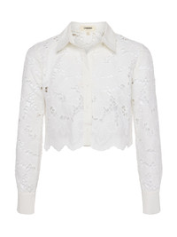 The Seychelle is our fresh, modern take on the lace blouse. A boxy, cropped fit delivers a cool, effortless feel that balances the feminine floral lace. A sharp collar and button-cuff sleeves add a tailored crispness. Throw the Seychelles on over your swimsuit for sophisticated beach style, or pair it with our Livvy pant for a beautiful monochromatic look. Style No. 40587PCS-WHIT DETAILS & FIT - Model Details: Height 5’9.5" | Bust 32" | Waist 24" | Hips 35" | Shoe 8 | Wearing Size XS - About 18.25" From Shoulder to Hem - Sleeve Length: 23.25" MATERIALS & CARE Composition - 100% Cotton - Imported