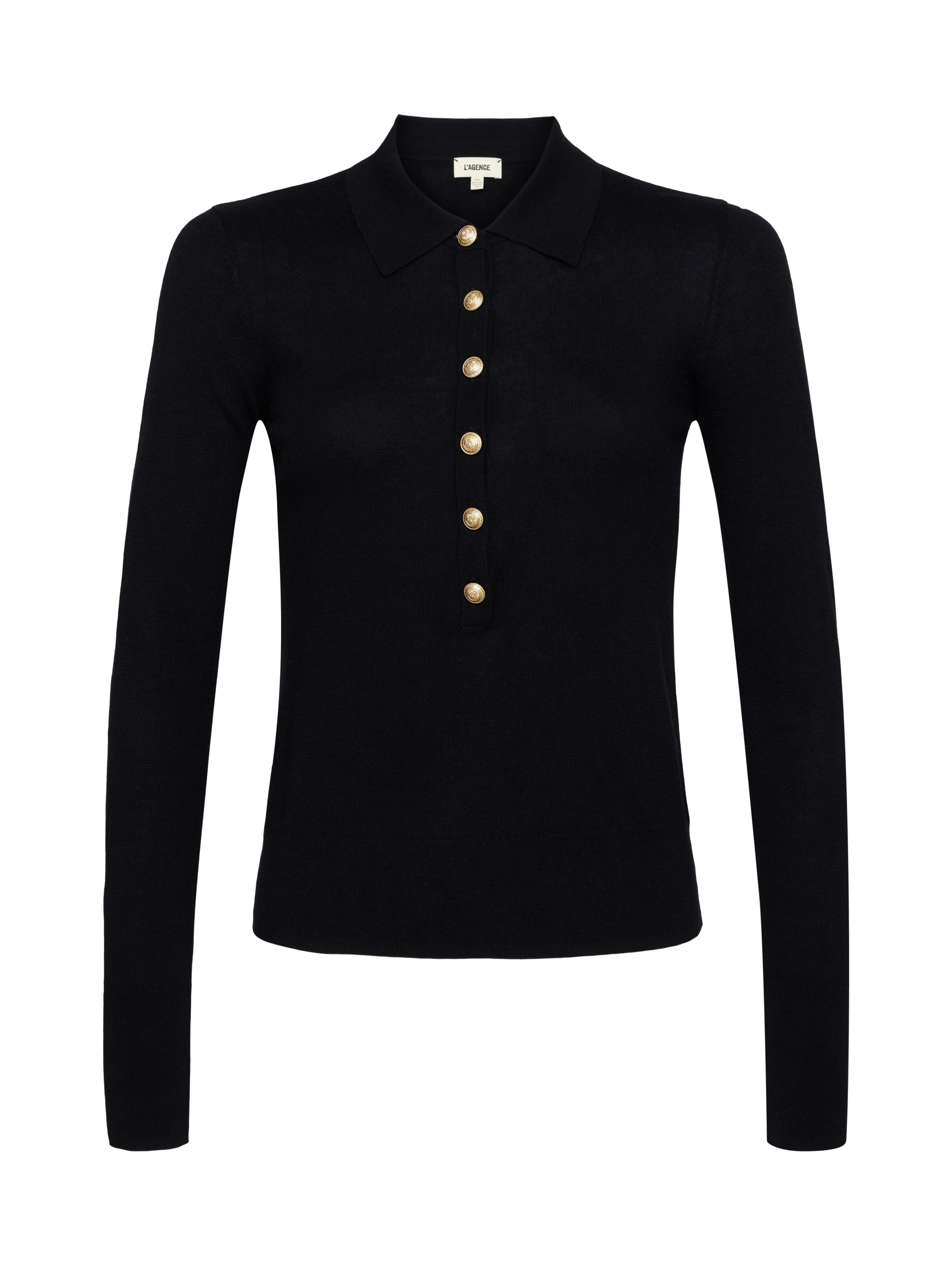 The L’AGENCE essential long sleeve knit and one of our fashion director’s favorite closet heroes. Now in a versatile black. • Premium knit with a hint of silk • Henley placket • Slim fit • Extended cuffs • Embossed dome buttons Style No. 8876PSO-BLGO DETAILS & FIT - Model Details: Height 5'10" | Bust 32" | Waist 24'' | Hips 34.5'' | Wearing Size XS - About 22" From Shoulder to Hem - Sleeve Length: 23.8" MATERIALS & CARE Composition - 70% Cotton 20% Nylon 10% Silk - Imported Care - Hand wash - Cold water - Do not dry clean - No bleach - Lay flat to dry - No tumble dry - Cool iron on reverse when needed