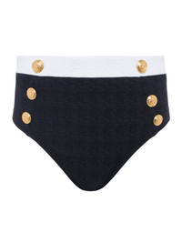 Our most flattering and sophisticated bikini bottom, featuring graphic contrast trim and decorative gold buttons. • Water-safe textured boucle fabric • Additional lining for shape and support • Moderate bottom coverage Style No. LG5AM99-BKWT DETAILS & FIT - Model Details: Height 5'10" | Bust 32" | Waist 24" | Hips 34.5" | Wearing Size XS - Moderate Coverage MATERIALS & CARE Composition - 93% Nylon 7% Spandex - Imported Care - Hand wash