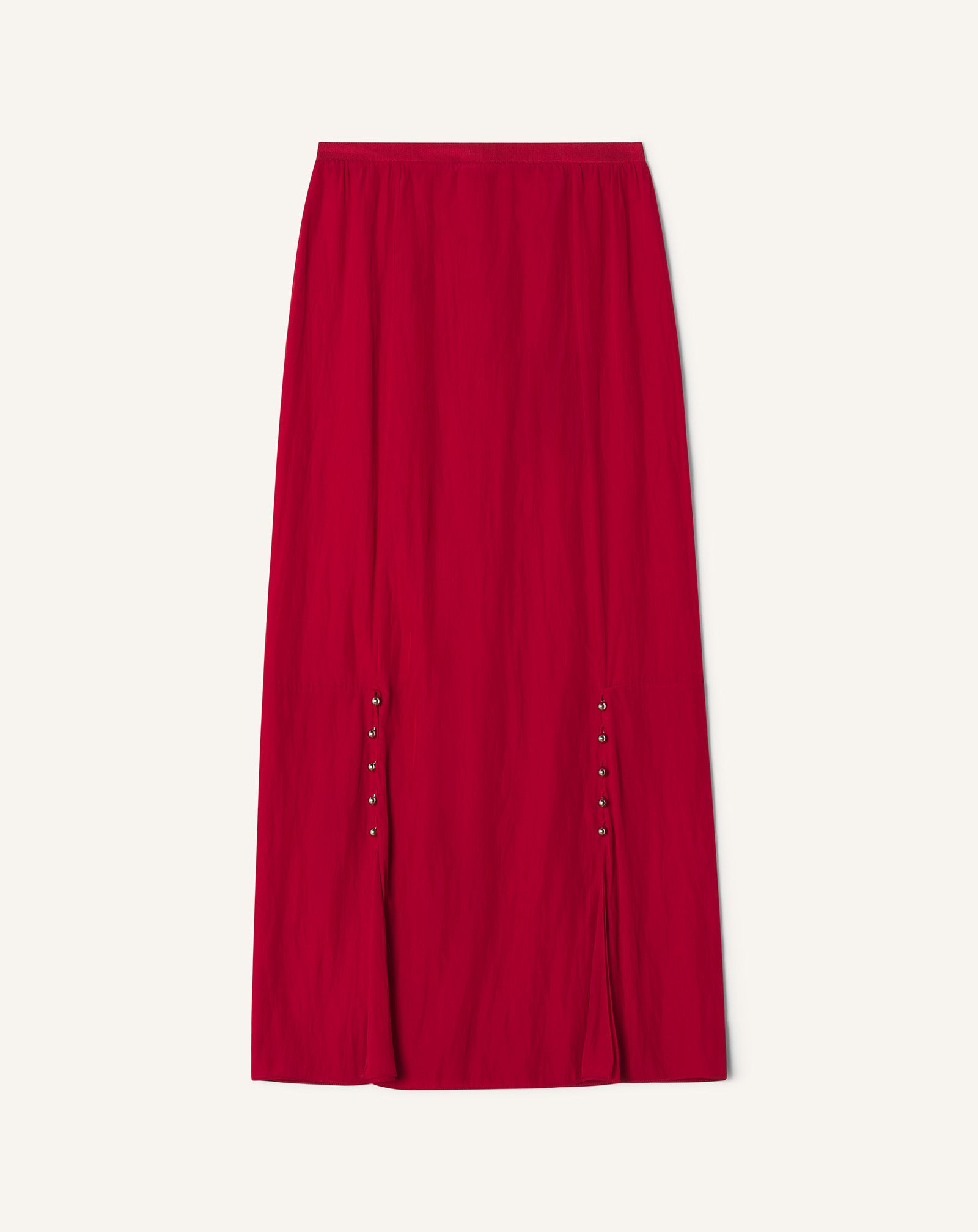 This skirt is crafted from Charmeuse fabric made in Japan. The material is wrinkle-resistant, yet very fluid and lightweight. It brings a delicate and feminine look to everyday style. Details - A-line midi skirt - Pleated and flowing design - Grosgrain waistband - Silver ball buttons on front - Invisible zipper in the back - Made in Portugal Size & fit - For more information, please see our size guide. Composition - Main fabric : 78% viscose woven,20% silk woven,3% elastane woven SKU: RW-ST0006-4778-H2535434