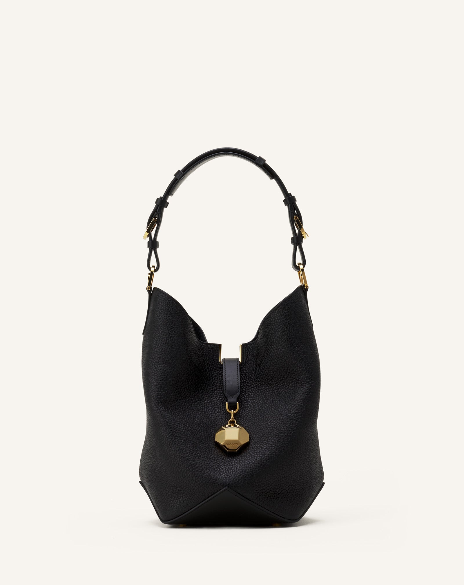 The Catch by Lanvin bucket bag is a must-have for an elegant yet casual daytime or evening outfit. Its jewel clasp pays homage to a 1936 House model. Ideal for city life, its compact interior has room for all your essentials. Details - Catch by Lanvin medium bucket bag in grained leather - Flap with jewel clasp and the Lanvin logo - Removable, adjustable shoulder strap - Compact mirror with tab and gilded metal frame featuring geometric lines - Lanvin logo with a gold finish on bottom side of bag - Made in Italy Composition - Main fabric : 100% calf - bos taurus - Lining : 100% lamb ovis aries SKU: LW-BGLQMM-GRCA-H2510U