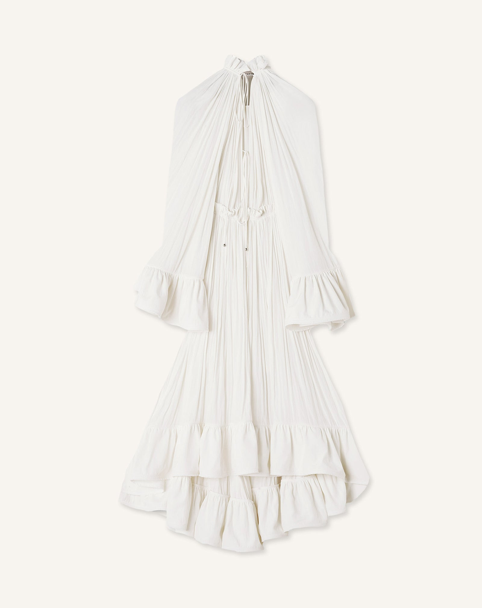 The pleats and frills of this dress create a fluid and chic movement. As evening wear, it embodies the elegance and femininity of the Lanvin wardrobe. Details - Charmeuse midi dress - Plunging frilled collar with a drawstring - Slip-on - Made in Portugal Size & fit - This style fits true to size, take your normal size - For more information, please see our size guide. Composition - Main fabric : 100% polyester woven SKU: RW-DRC042-4778-A2400142