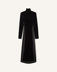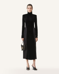 This dress plays on one of the Maison's signature aesthetics by creating a contrast of materials. A viscose and silk fabric is combined with a flowy dyed velvet to create a deep, rich color. This sophisticated piece is the perfect choice for evening wear. Details - Bi-material dress with cowl back - Fitted midi design - High collar - Built-in shoulder pads - Invisible zipper in the back - Made in Italy Size & fit - For more information, please see our size guide. Composition - Main fabric : 80% cellulose acetate,20% polyamide woven SKU: RW-DR0208-6108-H251036
