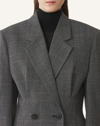 The Prince of Wales pattern on this jacket features three of this collection's signature colors: black, beige, and brown. The broad-shouldered cut, paired with a fitted waist, creates a resolutely structured and elegant daytime silhouette. Details - Double-breasted tailored jacket in woven wool - Loose style with a fitted waist - Notched collar - Built-in shoulder pads - Button placket on the cuffs - Two flap pockets - Made in Italy Size & fit - For more information, please see our size guide. Composition - Main fabric : 100% wool woven - Lining : 100% cupro woven SKU: RW-JA0002-6147-H2512436