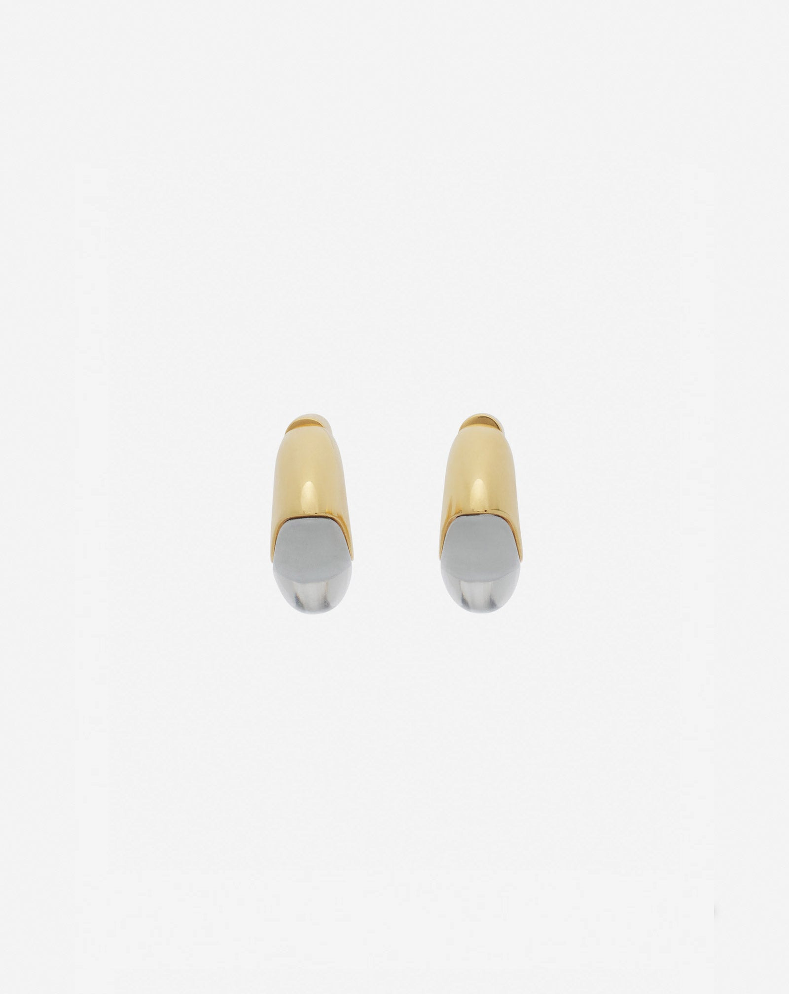 Drawing their inspiration from the 70s, these earrings embody one of the House's signatures, Contrast. They combine high-gloss metals with the transparency of Plexiglas. Details - Fargo large hoop earrings in brass - Bi-material resin with crystals and metal - Push button ring clasp - Made in Italy Size & fit - Dimensions : 2.3 (L) x 1 (l) x 2.5 (h) cm / 0.9 (L) x 0.4 (l) x 1.0 (h) in Composition - Main fabric : 100% brass SKU: AW-CJFBO1-REFG-E25M1S0U