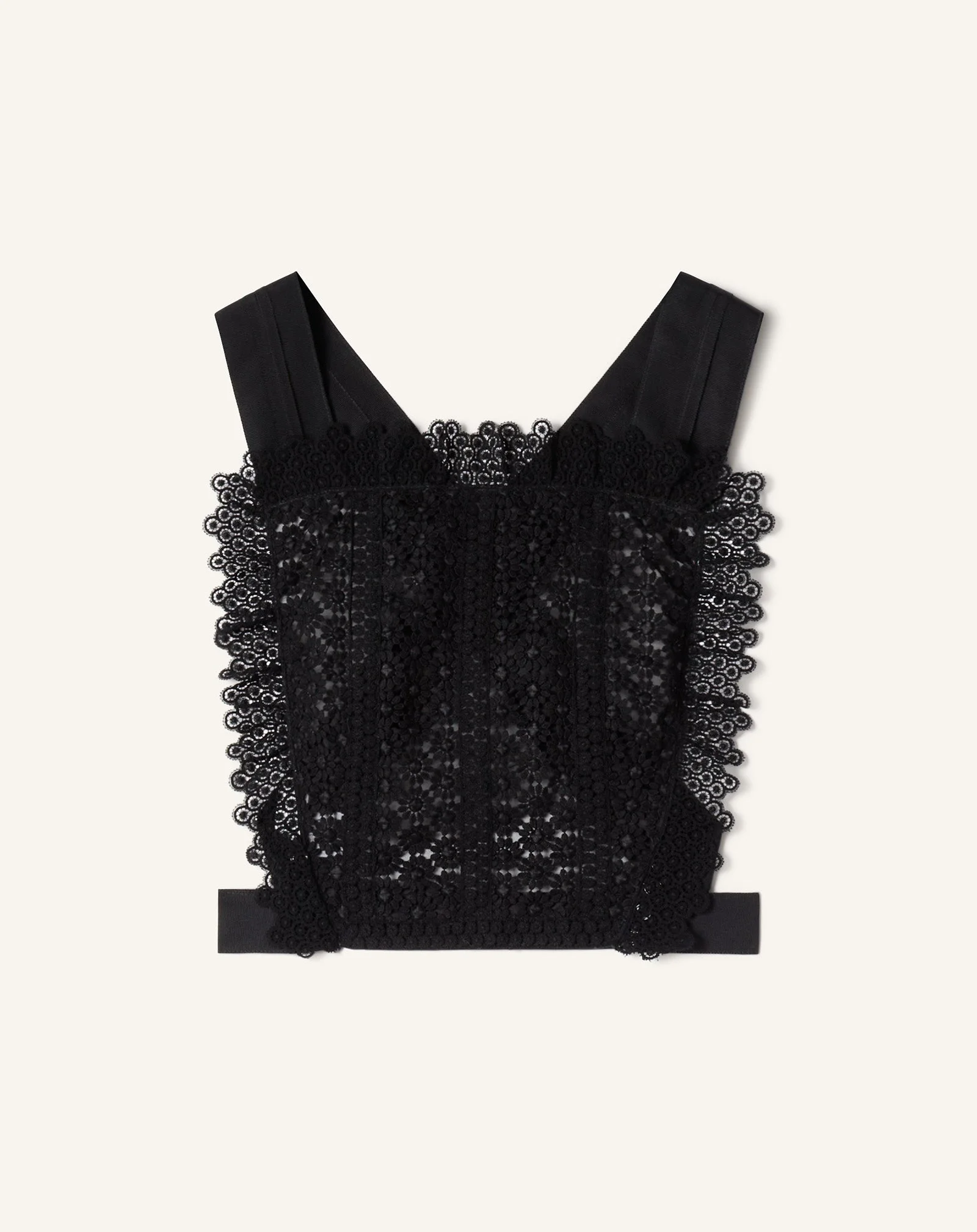 The guipure lace crafted for this bib features a delicate and elegant Marguerite motif as a tribute to Jeanne Lanvin's daughter. The bib, which is fastened at the back with ribbons, is a nod to the grosgrain ribbon used by Jeanne Lanvin to finish the interior of her Haute Couture dresses. It can be worn over a shirt or dress to add a sophisticated detail to a daytime outfit. Details - Guipure lace bib - Silk lining - Made in Italy Size & fit - This style is fitted, size up if you prefer a more relaxed fit - For more information, please see our size guide. Composition - Main fabric : 77% cotton woven,23% polyester woven - Lining : 100% silk woven SKU: RW-AC0001-6265-P261036